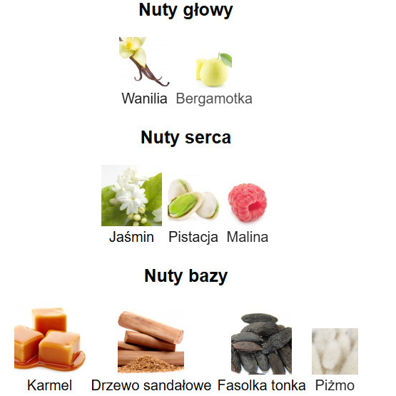 💖 Nuty serca – bogactwo kwiatowych i owocowych akcentów: szlachetny jaśmin łączy się z aksamitną pistacją i soczystą maliną, dodając zapachowi zmysłowej słodyczy i głębi.