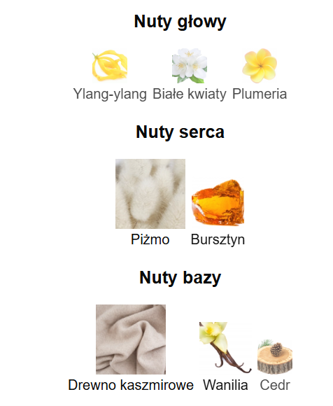 Nuty głowy: Ylang-ylang, Białe kwiaty i Plumeria;